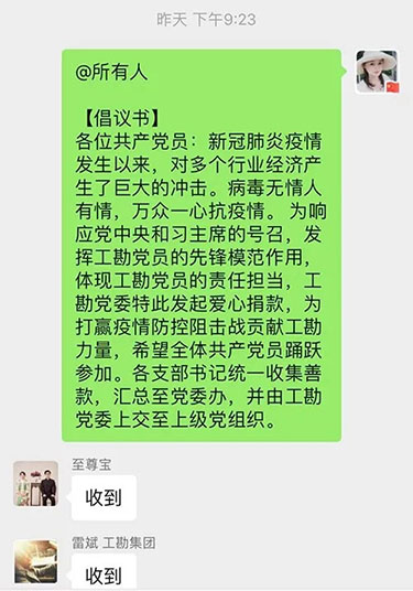 倡議一經(jīng)發(fā)出,工勘集團(tuán)黨委委員及各支部書記第一時(shí)間發(fā)揮“頭雁”作用,帶頭捐款,廣大黨員積極響應(yīng),入黨積極分子和群眾也紛紛表示要向黨員學(xué)習(xí),為防疫工作貢獻(xiàn)出自己的一份力量。眾志成城齊戰(zhàn)“疫”,短短兩個(gè)小時(shí),集團(tuán)黨委就收集到愛心捐款38700元,用涓涓細(xì)流匯聚成齊心戰(zhàn)“疫”的愛心暖流。