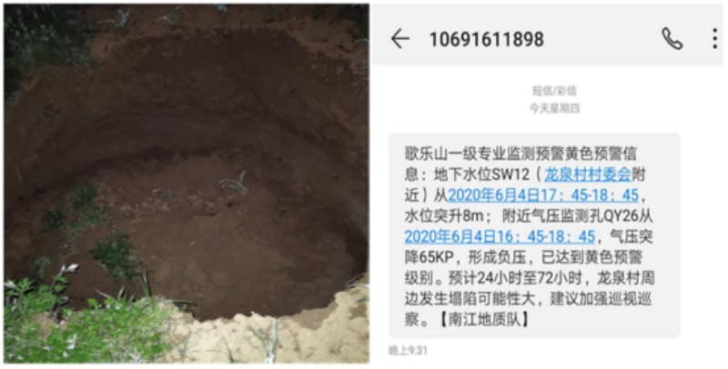 在與我方確認(rèn)了監(jiān)測(cè)設(shè)備和監(jiān)測(cè)平臺(tái)運(yùn)行正常的條件下,南江隊(duì)判定位于重慶歌樂山龍泉村村委會(huì)附近12號(hào)監(jiān)測(cè)點(diǎn)附近發(fā)生塌陷的可能性很大,于2020年6月4日21點(diǎn)30分通過分析遠(yuǎn)程自動(dòng)化監(jiān)測(cè)數(shù)據(jù),發(fā)出預(yù)警。6月4日21時(shí)50分,距農(nóng)房100米處,發(fā)生地面塌陷,塌陷坑直徑約3米,深約3米,未造成人員傷亡。6月6日19時(shí)54分,附近又發(fā)生一處地面塌陷,塌陷坑直徑約1.5米,深約0.3米,未造成人員傷亡。